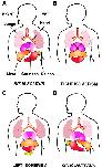 The normal disposition of organs is called situs solitus (A). The right lung has three lobes, whereas the left lung (indicated in a different color for clarity) has two. In addition, the apex of the heart points to the left side, the liver is on the right side, and the stomach and spleen are on the left side. Although not shown in the figure, the gut coils counterclockwise in the abdominal cavity.