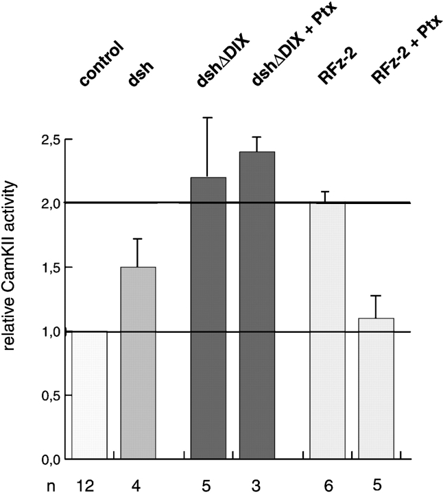 Figure 3. XDshΔDIX activates CamKII activity in a PTX-insensitive manner. Two-cell-stage Xenopus embryos were injected with RNAs encoding Rfz2, XDsh–GFP, XDshΔDIX–GFP, or PTX and processed for an in vitro CamKII activity assay. Injection of wt XDsh–GFP RNA produces a mild increase in CamKII activity compared with control embryos, whereas Rfz2 and XDshΔDIX–GFP RNAs produce a twofold activation compared with control embryos. Activation of CamKII by XDshΔDIX–GFP, unlike Rfz2, was not sensitive to coexpression of PTX. CamKII is rarely induced above two to threefold in any system (for review see Kühl et al., 2000a).