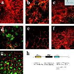 Figure 1. XDshΔDIX activates PKC in a PTX- insensitive manner. Two-cell-stage Xenopus embryos were injected with RNAs encoding XPKCα–myc (0.5–1 ng) plus XDsh–GFP (0.5–1 ng), XDshΔDEP–GFP (0.5–1 ng), XDshΔDIX–GFP (0.5–1 ng), Rfz2 (0.5–1 ng), PTX (1–2 ng), and/or LacZ (as a control for normalizing levels of injected RNA, 0–4 ng) and cultured to stage 8, and animal caps were explanted. (a) XPKC (red) is localized primarily in the cytoplasm under control conditions. (b) Ectopic XDsh–GFP (green), which is localized to punctate structures, is relatively weak at activating translocation of XPKC (red) to the membrane. (c) XDshΔDEP–GFP (green) as well as XDshΔPDZ–GFP (not depicted) do not activate XPKC (red) membrane translocation. (c, inset) XDsh–GFP (lane 1) and XDshΔDIX–GFP (lane 2) are expressed equally, as detected by an anti-GFP Western blot. Although the protein in lane 2 migrates more rapidly on gels compared with lane 1 (not depicted), it is aligned with lane 1 to facilitate the comparison of signal intensities. (d) Expression of XDshΔDIX–GFP (green) activates translocation to the membrane of PKC (red). (e) Rfz2 (untagged) activates membrane translocation of XPKC (red). (f) Rfz-2–mediated membrane translocation of XPKC (red) is partially blocked by PTX. (g) The ability of XDshΔDIX–GFP (green) to induce membrane translocation of XPKC (red) is not blocked by PTX. (h) A schematic representing the three domains of Dsh discussed in the text.