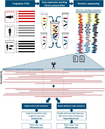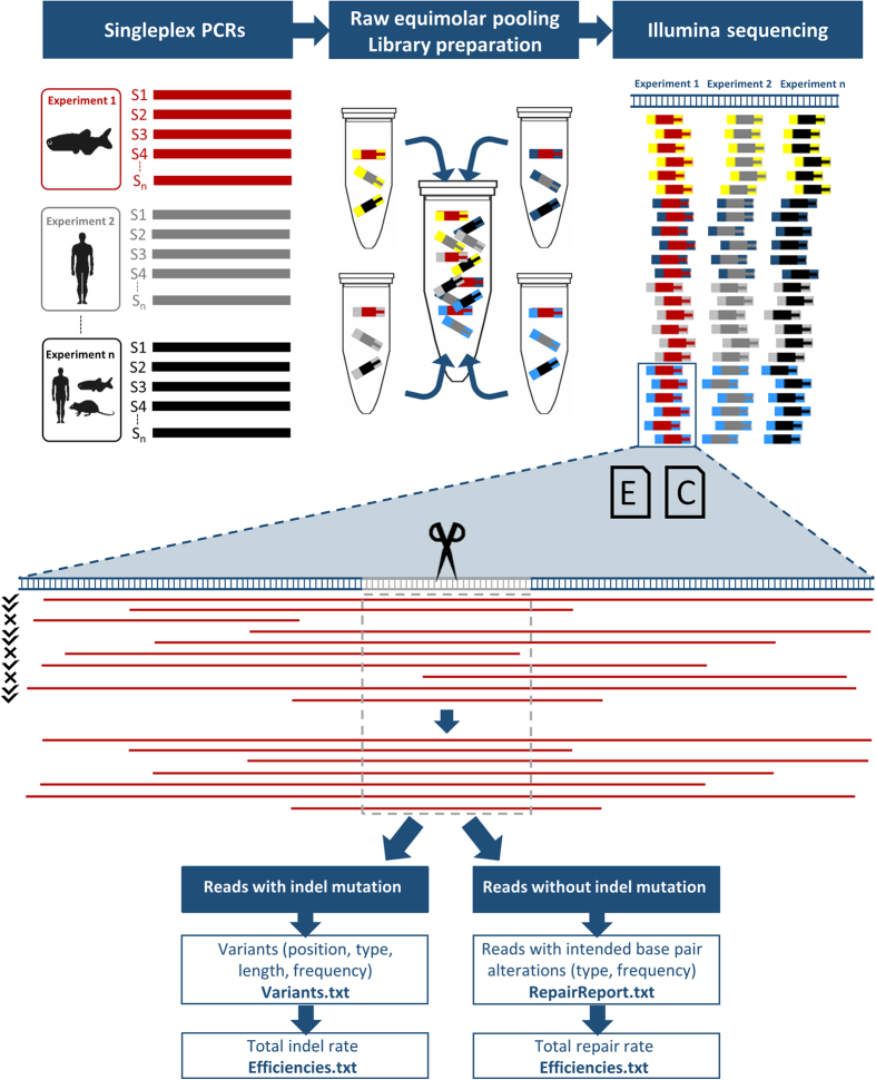 Figure 1. Implementation of BATCH-GE. Multiple singleplex PCR products (S1, S2, …, Sn) (upper panel, left) that correspond to different genomic sequences in one specific or in different genomes are pooled in equimolar amounts. Subsequently, the pools are used as DNA input for NGS library preparation using the Nextera XT library preparation kit, which simultaneously fragments and tags input DNA (upper panel, middle). The tagging involves the addition of unique adapter sequences in order to provide sequencing indices on both sides of the amplicons (depicted by yellow, grey, light and dark blue bars). In a final step, all molecules are pooled in a single tube prior to NGS sequencing (upper panel, right). BATCH-GE analyses the data sample-by-sample in an automated batchwise manner. The experimental specifications needed to run BATCH-GE are supplied via two input files (middle panel, E (Experiment.csv) and C (Cutsites.bed) icons). In a first step, raw sequencing data is converted into the SAM file format. Secondly, BATCH-GE screens the reads in the SAM file for their coverage of the region(s) of interest, which are user-defined regions, encompassing the theoretical CRISPR/Cas9 cut site, 3 base pairs upstream of the PAM sequence (middle panel, grey sequence). Thirdly, reads that do not fully cover the region of interest are discarded from the analysis, since they lack information about the presence or absence of indels in this region (middle panel, indicated by a mark/cross). Subsequently, the remaining reads (indicated by a tick) are screened for insertions and deletions initiated within the same user-defined region of interest (middle panel, grey dash-lined box). The detected indel variants, along with information about their position, type, length and their frequency are written to a ‘Variants’ text file. Reads that do not contain any indel, are screened for the presence of intended base pair alterations. Frequencies of partial and full repairs are listed in the ‘RepairReport’ file. Additionally, general indel and repair rates are indicated in the ‘Efficiencies’ file. Lastly, URLs (‘URL’ file) enable read visualization in the freeware UCSC Genome Browser database22.