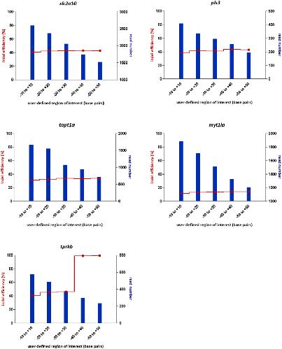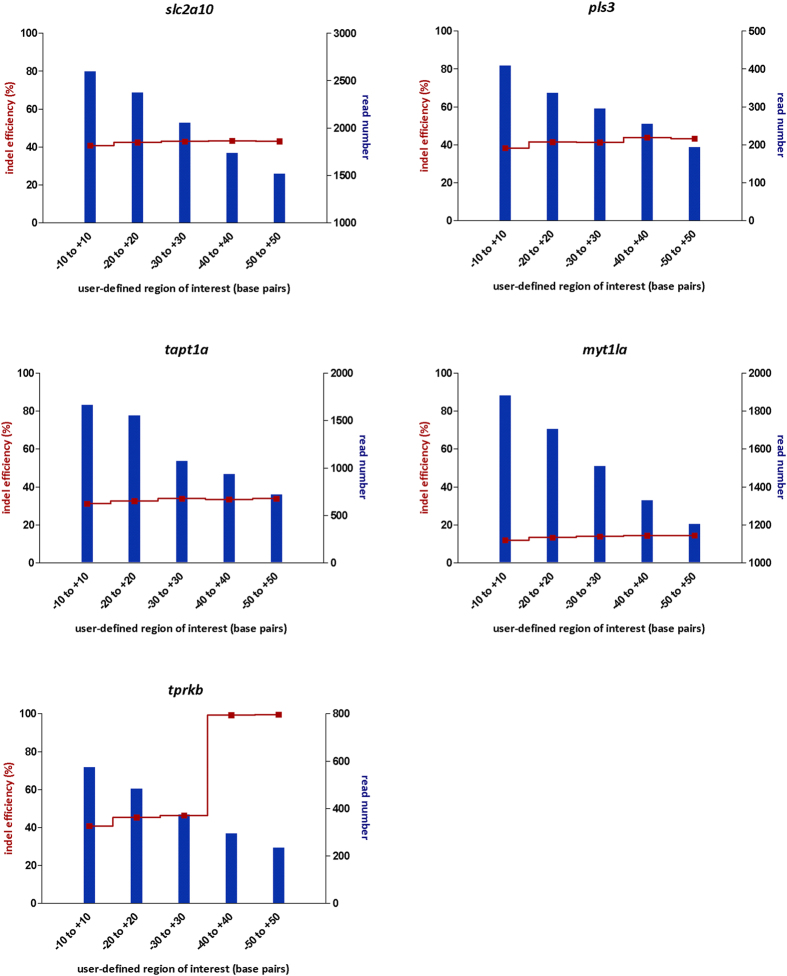 Figure 3. Indel rates and read number, as a function of the size of the region of interest used in BATCH-GE.The raw sequencing data derived from CRISPR/Cas9 assays (slc2a10, pls3, tapt1a, myt1la, tprkb) injected with 25 pg sgRNA and 250 pg Cas9 and analysed at 1 dpf were reanalysed while varying the size of the region of interest from 20 to 100 bp. The blue bars represent the number of reads retained by BATCH-GE when screened for coverage of the user-defined region of interest. The red line represents the indel rate as a function of the size of the region of interest.