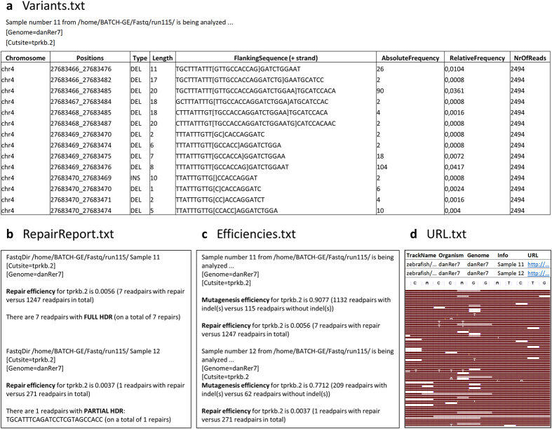 Figure 2. BATCH-GE output files for a specific genome editing experiment targeting the tprkb gene. (a) The ‘Variants’ text file lists chromosome, chromosomal location of the variant, type of the variant, length, the reference sequence surrounding the indel (10 bp upstream and 10 bp downstream of the indel) with [] marking the inserted sequence or with [deleted base pairs] marking the deleted sequence, and absolute and relative frequency of the variants. (b) In case of HDR analysis, the reads which do not contain any indel, are screened for the presence of the intended base pair alterations. BATCH-GE can distinguish between full and partial repair, in case multiple base pair alterations are intended to be introduced in the region of interest. If partial repair is encountered, the specific sequence of the partial repair is listed. (c) General indel and repair rates are shown in the ‘Efficiencies’ file. (d) URLs are generated (‘URL’ file) which allow visualization of the reads in the freeware UCSC Genome Browser database26. However, if the number of total reads (also the reads that are discarded by the tool) exceeds 1000, visualization via UCSC is no longer possible. As an alternative, raw NGS result files (fastQ) can be uploaded into the Integrative Genomics Viewer (IGV)1920.
