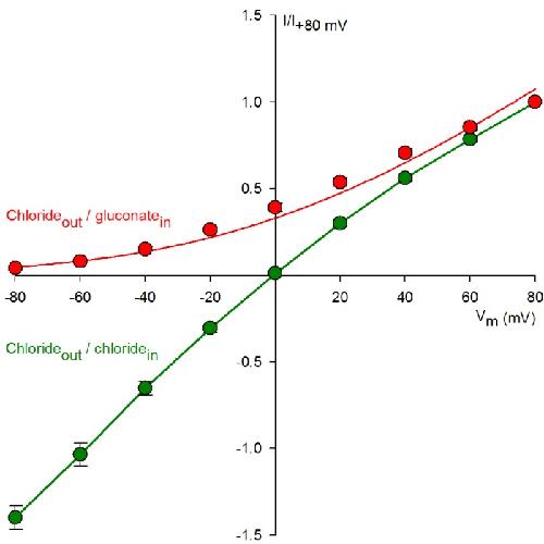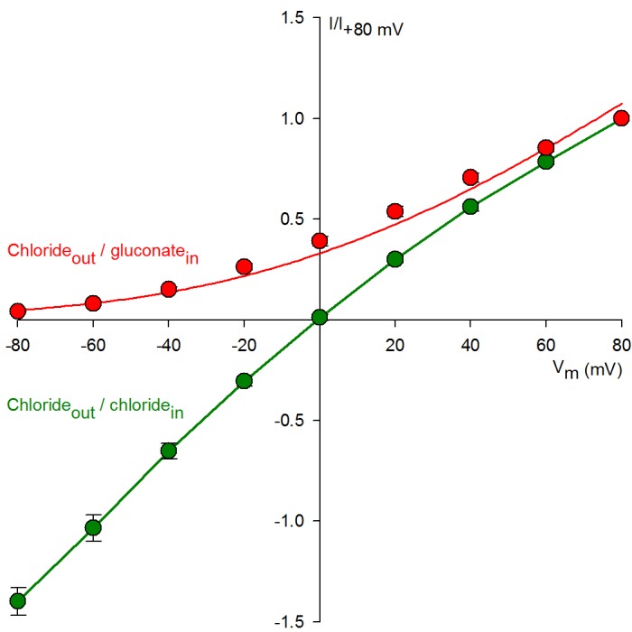 http://dx.doi.org/10.7554/eLife.18164.003Figure 1—figure supplement 1. Replacement of bath chloride with gluconate abolishes CFTR currents at -80 mV.Normalized macroscopic current-voltage relationships of WT CFTR under chloride(out)/chloride(in) (green symbols) and chloride(out)/gluconate(in) (red symbols) ionic conditions (n = 6–9). For both ionic conditions macroscopic steady CFTR currents in 2 mM ATP, and background currents in the absence of ATP, were sampled at membrane voltages ranging from −80 to +80 mV, and ATP-dependent currents normalized to that measured at +80 mV. The Red solid line is a fit to the Goldman-Hodgkin-Katz equation, the green solid line is a linear interpolation between data points. Note mild inward rectification in symmetrical chloride (Cai et al., 2003).DOI: