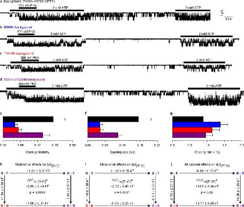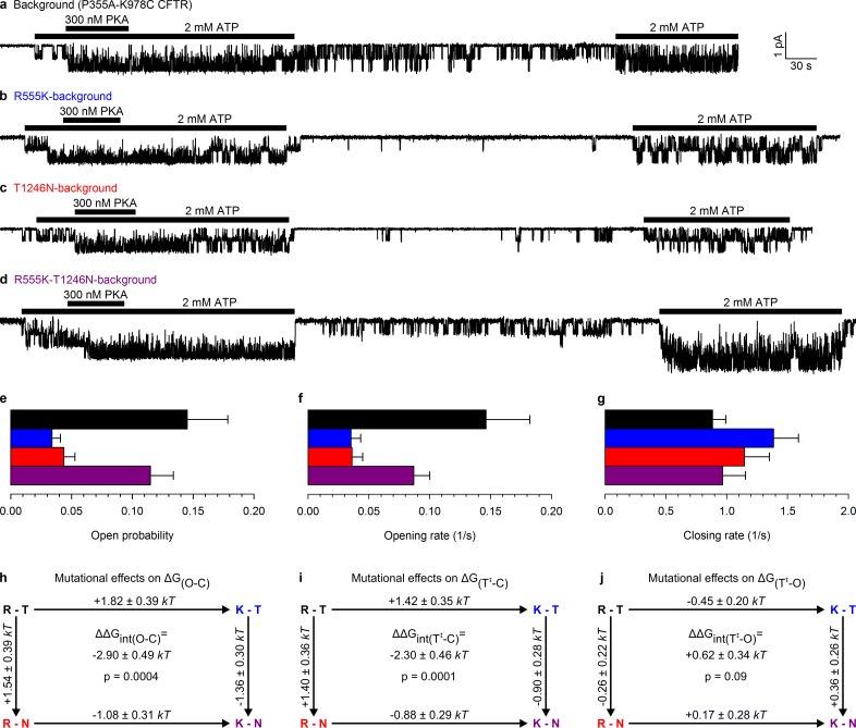 Figure 2. Arg 555 and Thr 1246 become energetically coupled upon spontaneous pore opening.(a–d), Microscopic currents at −80 mV, and their dependence on ATP and PKA (black bars), for (a) the P355A-K978C background construct, and for this background construct carrying (b) the R555K or (c) T1246N single mutations or (d) the R555K-T1246N double mutation. (e–g), Spontaneous open probabilities (e, n = 19–21), opening rates (f, n = 15–19), and closing rates (g, n = 15–19) of the background construct (black bars), and of constructs carrying additional R555K (blue bars), T1246N (red bars), or R555K-T1246N (violet bars) mutations. (h–j), Thermodynamic mutant cycles showing mutation-induced changes (h) in the stability of the spontaneous open state relative to the closed state, and (i–j) in the height of the activation free energy barriers for spontaneous opening (i) and closure (j). Each corner is represented by the side chains at positions 555 and 1246; k, Boltzmann's constant, T, absolute temperature.DOI: