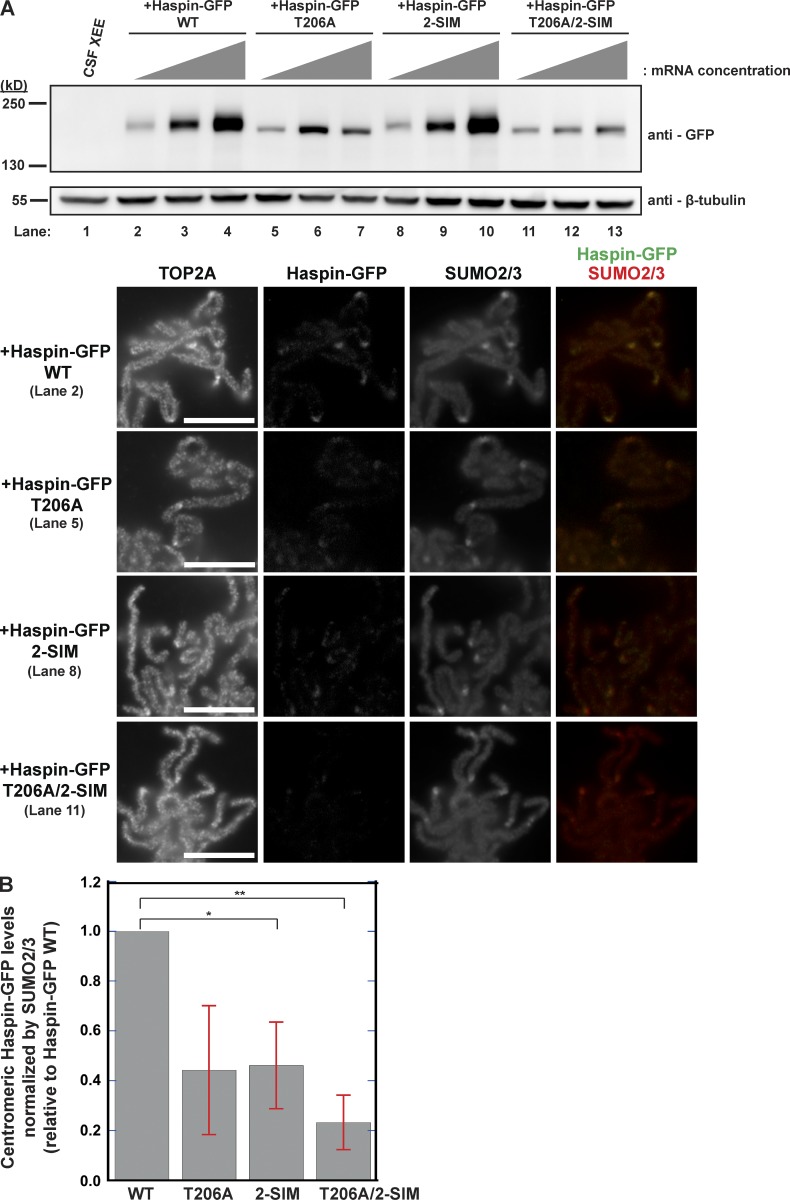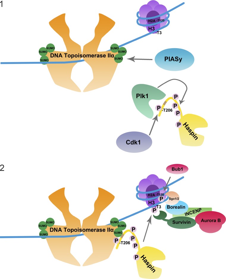 SUMOylation of DNA topoisomerase IIα regulates histone H3 kinase Haspin and H3 phosphorylation in mitosis.