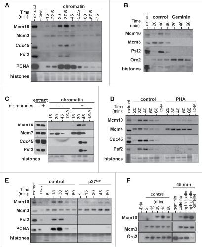 Figure 1. Mcm10 chromatin loading requirements. A, Xenopus egg extract was supplemented with demembranated sperm nuclei. After incubation for the indicated times, chromatin was isolated and immunoblotted for Mcm10, Mcm3, Cdc45, Psf2 and PCNA. The lower portion of the gel was stained with Coomassie to visualize histones. (B- F), Interphase (B, D, E, F) or membrane free (C) egg extracts were supplemented with demembranated sperm nuclei and were optionally supplemented with Geminin (B), 50 μM PHA-767491 (D), 100 nM p27kip1 (E), 40 µM aphidicolin or 5 mM Caffeine (F). At the indicated times, chromatin was isolated and immunoblotted for Mcm10, Mcm3, Mcm4, Mcm7, Orc2, Cdc45, Psf2 and PCNA.