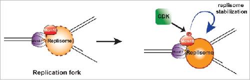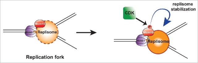 Figure 6. The role and regulation of Mcm10 in Xenopus egg extracts. Replication forks are shown, with DNA in black, the CMG helicase in purple, Mcm10 in red, and other replisome proteins in orange. Mcm10 is required for stability of the other replisome proteins, and this effect is enhanced when Mcm10 is phosphorylated by CDK.
