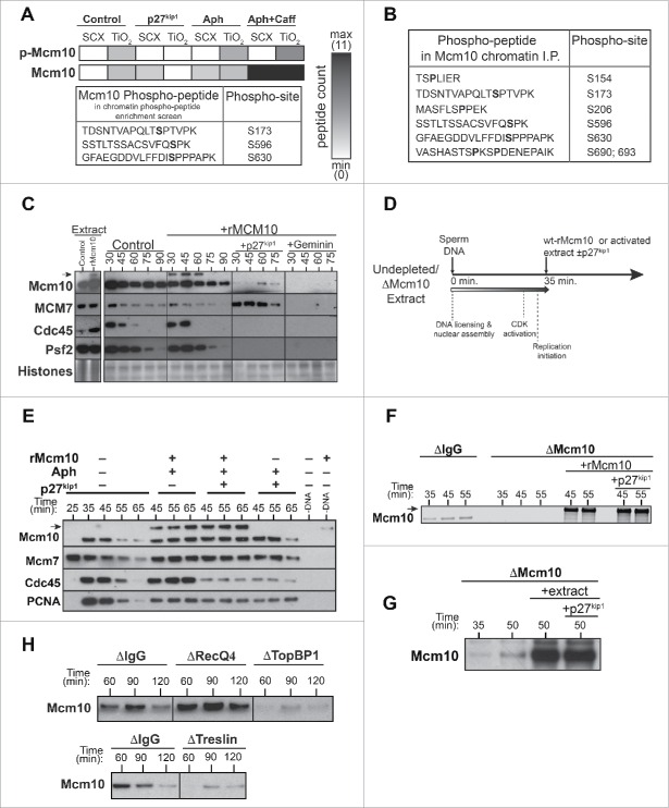 Figure 2. CDK-regulation of Mcm10 chromatin loading. A, B, CDK-dependent phosphopeptides of chromatin bound Mcm10 identified in mid-S-phase chromatin by phosphopeptide enrichment of total proteins (A) or direct immunoprecipitation (B) of Mcm10 followed by mass spectrometric analysis. (A) Heat map for Mcm10 phosphopeptides enrichment observed in control, CDK-inhibited (p27kip1), replication inhibition (aphidicolin, Aph), checkpoint-inhibition (caffeine, Caff) with black showing the presence and white the absence of a peptide. C, Extracts were supplemented with demembranated sperm nuclei with or without the addition of 1 ng/µl wt-rMcm10. Samples containing rMcm10 were optionally supplemented with p27kip1 or Geminin. After incubation for the indicated times, chromatin was isolated and immunoblotted for Mcm10, Mcm7, Cdc45 and Psf2. The lower portion of the gel was stained with Coomassie to visualize histones. D-G, Undepleted or Mcm10 depleted interphase egg extracts were supplemented with demembranated sperm nuclei. After incubation for 35 min, aliquots were optionally supplemented with wt-rMcm10 or undepleted interphase extract with or without p27kip1. At the indicated times, chromatin was isolated and immunoblotted for Mcm10 and/or Mcm7, Cdc45 and PCNA. (D) Cartoon of experimental set-up. (E) rMcm10 was added to undepleted extracts at 35 in presence of p27kip1, aphidicolin or both. (F, G) rMcm10 or undepleted extract was added to Mcm10 depleted extract at 35 min in presence of p27kip1. H, Control (nonimmune IgG), RecQ4, TopBP1 or Treslin depleted extract were supplemented with demembranated sperm nuclei. After incubation for the indicated times, chromatin was isolated and immunoblotted for Mcm10.