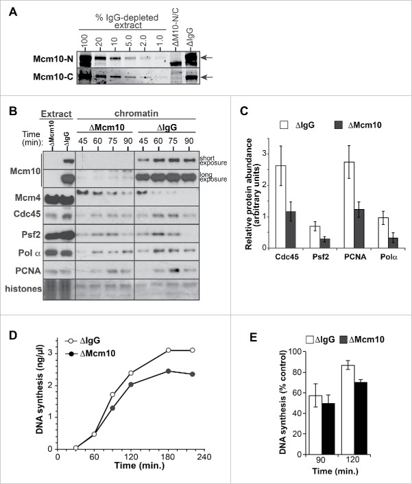Figure 3. Lack of Mcm10 leads to reduction in chromatin bound replisome proteins. A, Egg extract was immunodepleted with either nonimmune IgG or Mcm10 antibodies (raised against N- or C-terminus of the protein). So that the efficiency of depletion could be estimated, 0.5 µl of each of the depleted extracts and known amounts of nonimmune-depleted extract was immunoblotted for Mcm10 using 2 different antibodies. B, Control (nonimmune IgG) and Mcm10 depleted extract were supplemented with demembranated sperm nuclei. After incubation for the indicated times, chromatin was isolated and immunoblotted for Mcm10, Mcm4, Cdc45, Psf2, Pol α and PCNA. The lower portion of the gel was stained with Coomassie to visualize histones. C, Quantitation of Cdc45, Pol α, PCNA and Psf2 bound to chromatin at 60 min in control and Mcm10 depleted extracts. Mean and SEM of 3 independent experiments is shown. D, E, Control and Mcm10 depleted extracts were supplemented with 3 ng DNA/µl and [α-32 P]dATP; total DNA synthesis was determined at the indicated times. (E) Mean incorporation of [α-32 P]dATP at 90 and 120 min. and SEM of 3 independent experiments is shown.