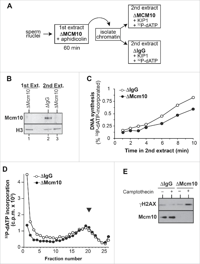 Figure 4. Mcm10 loss affects replication fork elongation and replisome stability. A-C, Mcm10-depleted interphase egg extracts were supplemented with demembranated sperm nuclei and 100 µM aphidicolin. After 60 min incubation, chromatin was isolated. Chromatin was then incubated in non-immune or Mcm10 depleted extract supplemented with 100 nM p27kip1 and optionally with [α-32 P]dATP. (A) Cartoon of experimental set-up. (B) Chromatin isolated after incubation in the first (lane 1) and second extracts (lane 2, 3) was immunoblotted for Mcm10 and histone H3. (C) At the indicated times, incorporation of [α-32 P]dATP into nascent DNA strand was determined. (D) Control (nonimmune IgG) and Mcm10 depleted extract were supplemented with 15 ng DNA/µl. At 120 mins [α-32 P]dATP was added for 15 seconds, and then DNA was isolated and separated on alkaline sucrose gradients. The 32 P content of fractions was determined by scintillation counting. The black arrowhead shows the migration of tRNA in a parallel neutral sucrose gradient. (E) Non-immune and Mcm10 depleted extract were supplemented with demembranated sperm nuclei and optionally supplemented with 50 µM camptothecin. At 60 min., chromatin was isolated and immunoblotted for Mcm10 and γH2A-X.