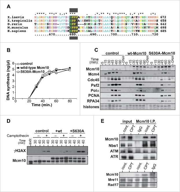 Figure 5. CDK-dependent Mcm10 phosphorylation is important for its function. A, Comparison of a segment of Mcm10 protein sequence alignment from Xenopus laevis, Xenopus tropicalis, Dana rerio, Mus musculus and Homo sapiens. B, C, Interphase extract was supplemented with demembranated sperm nuclei and optionally supplemented with [α-32 P]dATP, wt-Mcm10 or S630A-Mcm10. (B) At the indicated times, DNA synthesis was determined by measuring [α-32 P]dATP incorporation. A representative of 3 independent experiment is shown. (C) Chromatin was isolated at indicated times and immunoblotted for Mcm10, Mcm7, Cdc45, Psf2, Polα, or PCNA. The lower portion of the gel was stained with Coomassie to visualize histones. (D) Interphase extract was supplemented with demembranated sperm nuclei and optionally supplemented with wt-Mcm10, S630A-Mcm10 or 50 µM camptothecin. After incubation for the indicated times, chromatin was isolated and immunoblotted for Mcm10 and γH2A-X. (E) Interphase extract was supplemented with demembranated sperm nuclei and optionally supplemented with 50 µM camptothecin. At 45 min. chromatin Mcm10 was immunoprecipitated using antibodies against Mcm10 and samples were immunoblotted for Mcm10, ATR, ATM, Nbs1, Mre11 and Rad17.