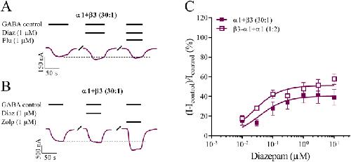 Baur, Covalent modification of GABAA receptor isoforms by a diazepam analogue provides evidence for a novel benzodiazepine binding site that prevents modulation by these drugs. 2008, Pubmed , Xenbase