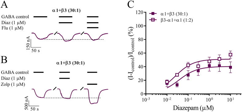 Zolpidem is not a typical GABAA receptor hypnotic. Unlike benzodiazepines, zolpidem modulates tonic GABA currents in the rat dorsal motor nucleus of the vagus, exhibits residual effects in mice lacking the benzodiazepine binding site, and improves speech, cognitive and motor function in human patients with severe brain injury. The receptor by which zolpidem mediates these effects is not known. In this study we evaluated binary α1β3 GABAA receptors in either the 3α1:2β3 or 2α1:3β3 subunit stoichiometry, which differ by the existence of either an α1-α1 interface, or a β3-β3 interface, respectively. Both receptor stoichiometries are readily expressed in Xenopus oocytes, distinguished from each other by using GABA, zolpidem, diazepam and Zn(2+). At the 3α1:2β3 receptor, clinically relevant concentrations of zolpidem enhanced GABA in a flumazenil-sensitive manner. The efficacy of diazepam was significantly lower compared to zolpidem. No modulation by either zolpidem or diazepam was detected at the 2α1:3β3 receptor, indicating that the binding site for zolpidem is at the α1-α1 interface, a site mimicking the classical α1-γ2 benzodiazepine site. Activating α1β3 (3α1:2β3) receptors may, in part, mediate the physiological effects of zolpidem observed under distinct physiological and clinical conditions, constituting a potentially attractive drug target.