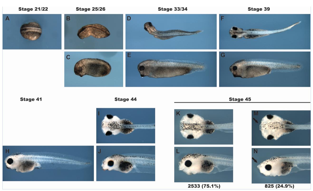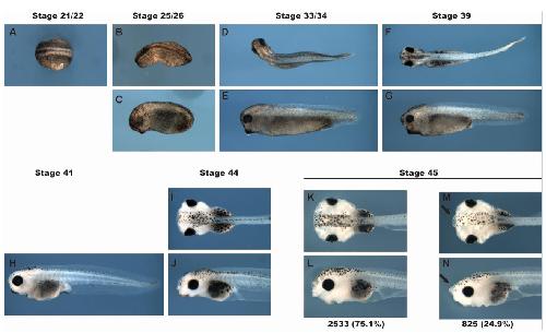 Supplementary Figure 1: Stage series of representative embryos produced by heterozygous noggin mutant adults. (A-J) Phenotypically wild-type embryos and tadpoles. (K-L) Wild-type tadpoles. Total number of tadpoles and percentage within each phenotypic class. (M-N) Abnormal tadpoles with dorsal âhorn.â Total number of tadpoles and percentage within each phenotypic class. (A,B,D,F,I,K,M) Dorsal views. (C,E,G,H,J,L,M) Lateral views. Anterior to the left.