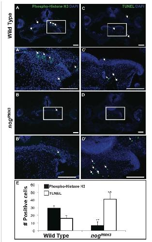 Supplementary Figure 2: Phospho-Histone H3 and TUNEL staining in Wild type and homozygous nogRMH3 mutant tadpoles. (A-B) Maximum intensity projections of WT (A) and homozygous nogRMH3 mutant (B) tadpole sections stained for Phospho-Histone H3 at stage 46. (Aâ,Bâ) higher magnification views of boxes shown in A and B. (C-D) Maximum intensity projections of WT (C) and homozygous nogRMH3 mutant (D) tadpole sections stained for TUNEL at stage 46. (Câ,Dâ) higher magnification views of boxes shown in A and B. All scale bars = 100μm. (E) Quantification of cells positive for either phospho-histone H3 (n=4/genotype) or TUNEL (n=7/genotype). **: p<0.05.