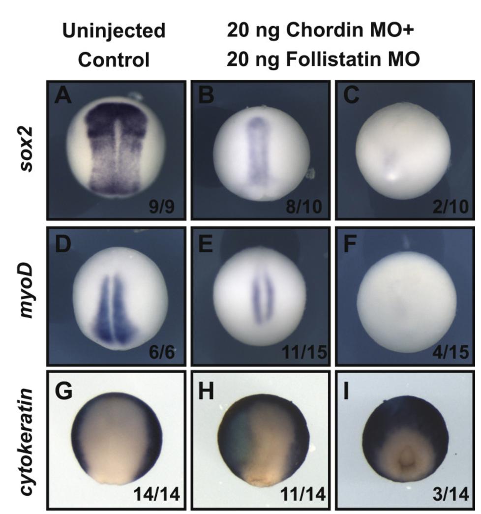 Knockdown of Chordin and Follistatin results in a loss of dorsal structures in a subset of embryos produced by heterozygous noggin mutant adults. (A-C) sox2 expression. (DâF) myoD expression. (GâI) cytokeratin expression (A,D,G) Uninjected control embryos. (B,C,E,F,H,I) Embryos injected with 20 ng Chordin morpholino and 20 ng Follistatin morpholino. Dorsal views with anterior towards the top. Though we failed to successfully genotype the stained embryos, the embryos in C, F, and I are predicted to be the noggin nulls.