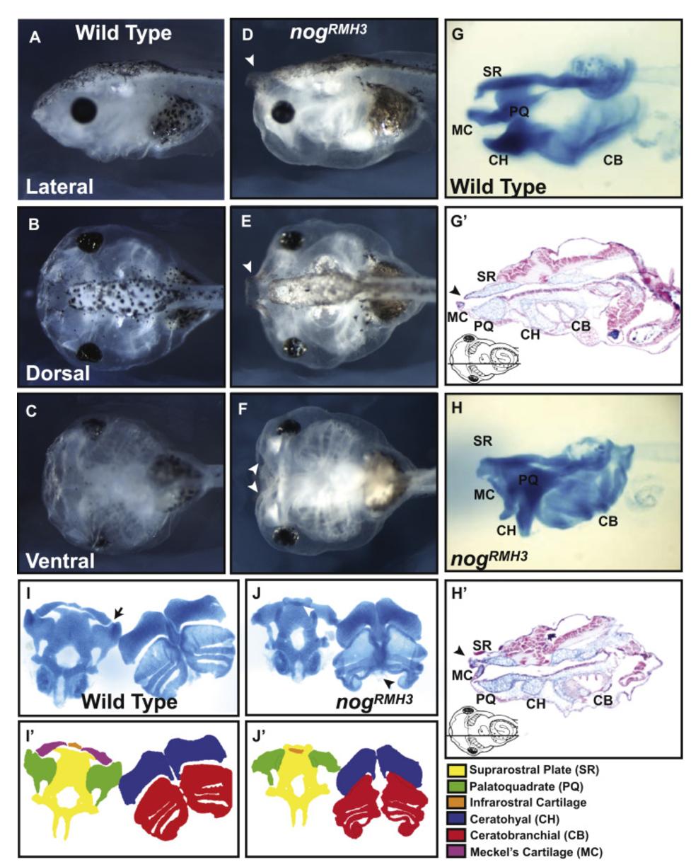 Homozygous nogRMH3 mutant Xenopus tropicalis have severe lower jaw deformities. (AâC) WT stage 46 tadpoles. (DâF) Homozygous nogRMH3 stage 46 tadpoles. Anterior towards the left. (A,D) Lateral views. (B,E) dorsal views. (C,F) Ventral views. (GâH) Sagittal views of whole-mount skeletal stains of WT (G) and mutant (H) and 10 µm sagittal sections stained with alcian blue and nuclear fast red of WT (Gâ²) and mutant (Hâ²) stage 46 skulls. (IâJ) Flat-mounted cartilage from WT (I) and mutant (J) tadpoles. (Iâ²âJâ²) Schematic of skeletal elements in (IâJ).