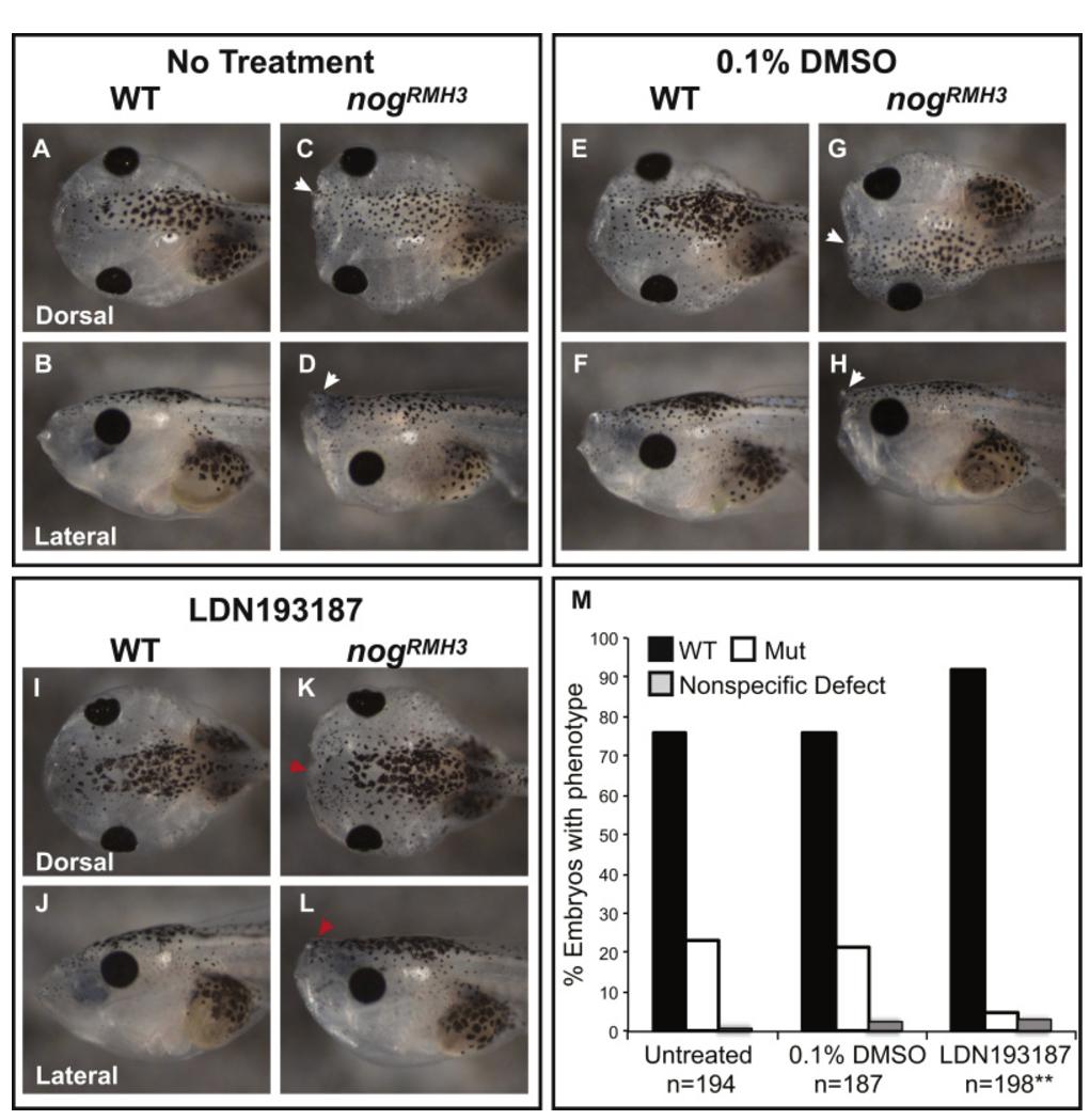 Inhibition of BMP signaling rescues the craniofacial defects observed in the tadpoles homozygous for the nogRMH3allele. (AâD) Untreated tadpoles at stage 45 (EâH) Tadpoles at stage 45 treated with 0.1% DMSO for 24 h at stage 28. (IâL) Stage 45 tadpoles treated with 10 μM LDN-193189 for 24 h at stage 28. Genotyping showed that the following representative embryos are wild-type (AâB,EâF,IâJ), while (CâD,GâH,KâL) are homozygous nogRMH3 tadpoles. (A,C,E,G,I,K) Dorsal views. (B,D,F,H,J,L) lateral views. White arrowheads show protruding suprarostral plate in the mutants, red arrowheads show rescued structures in mutants following treatment. (M) Quantification of phenotypes observed following treatments indicated. Black bars show the number of tadpoles with a wildtype phenotype, open bars show the number with the mutant phenotype and gray bars indicate tadpoles with non-specific defects. ** indicates p<0.0001.