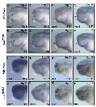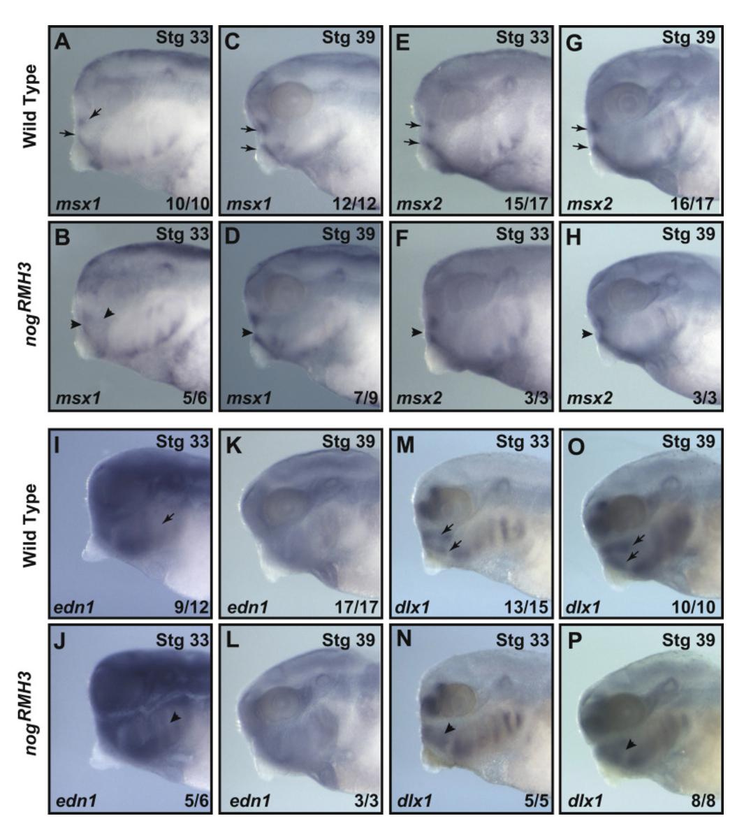 Expression patterns of BMP pathway target genes are affected by the homozygous nogRMH3 mutanion in a stage specific manner. (AâD) Expression of msx1 in the head of representative WT (A,C) and homozygous nogRMH3 (B,D) tadpoles. (EâH) Expression of msx2 in the head of representative WT (E,G) and homozygous nogRMH3 (F,H) tadpoles. (IâL) Expression of edn1 in the head of representative WT (I,K) and homozygous nogRMH3 (J,L) tadpoles. (MâP) Expression of dlx1 in the head of representative WT (M,O) and homozygous nogRMH3 (N,P) tadpoles. (AâB,EâF,IâJ,MâN) Stage 33. (CâD,GâH,KâL,OâP) Stage 38. Anterior to the left and dorsal towards the top. (A,C,E,G,I,K,M,O) Arrows show domains of expression of indicated genes in WT tadpoles. (B,D,F,H,J,L,N,P) Arrowheads show altered expression domains in homozygous nogRMH3 mutants.