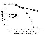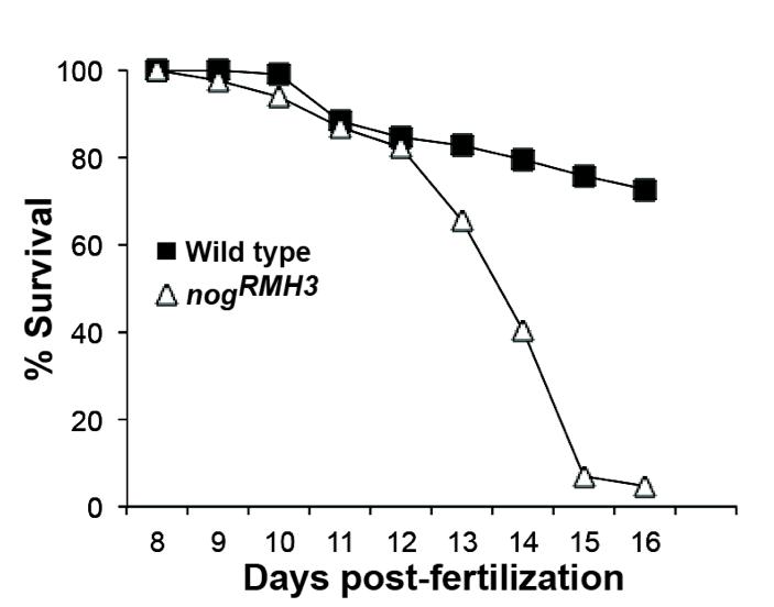 Supplementary Figure 3: Survival curve of Wild type and nogRMH3 mutant tadpoles Survival curve of 100 WT (closed boxes) and 100 mutant tadpoles (open triangles).