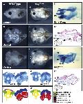 hand2 and bapx1 expression is altered in homozygous nogRMH3 mutant tadpoles. (AâD) Expression of hand2 in the head of representative WT (A,C) and homozygous nogRMH3 (B,D) tadpoles. (EâH) Expression of bapx1 in the head of representative WT (E,G) and homozygous nogRMH3 (F,H) tadpoles. (AâB,EâF) Stage 33. (CâD,GâH) Stage 39. Anterior to the left and dorsal towards the top. (M) Quantification of bapx1 expression domain shift as measured by the cement gland (CG) to otic vesicle (OV) length divided by the stained mandibular arch (MA) to eye (Ey) length. Black bars indicate wildtype embryos and open bars show mutant embryos. ** indicates p<0.05 (T-test). (A,C,E,G) Arrows show domains of expression of indicated genes in WT tadpoles. (B,D,F,H) Arrowheads show altered expression domains in homozygous nogRMH3 mutants.