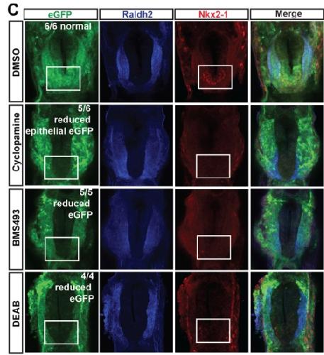 (B) Mouse embryos isolated at E7.5 and cultured for 2 days in DMSO, BMS493, or DEAB to inhibit RA signaling results in a failure of Nkx2-1+ respiratory progenitor induction but does not inhibit Nkx2-1+ thyroid or forebrain.