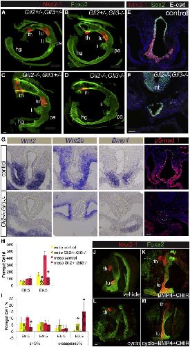 (G) In situ hybridization and immunostaining of E9.5 (23â27 s) sections show that Wnt2, Wnt2b, and Bmp4 expression, as well as pSmad1 require Gli2 and Gli3. The yellow dotted line outlines the foregut epithelium, and the red dotted line indicates the splanchnic lpm.