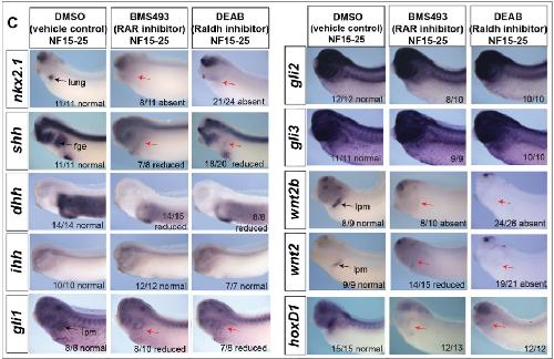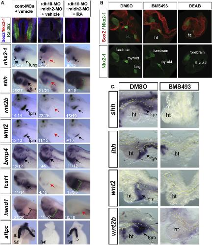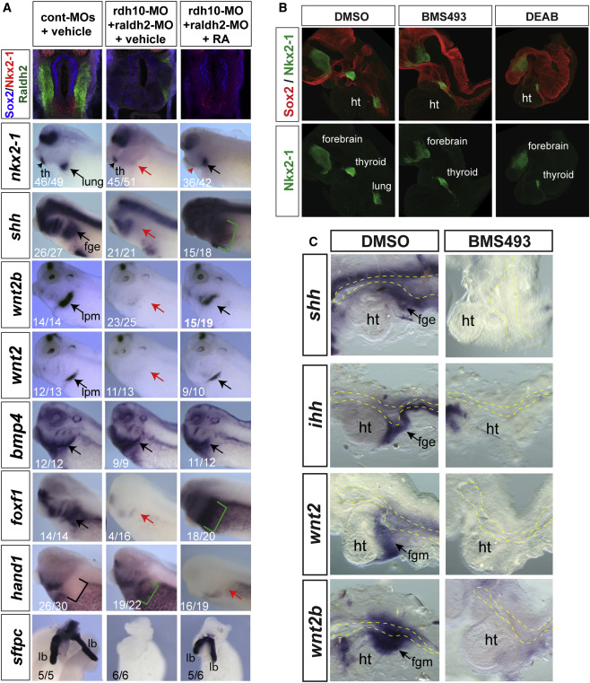(A) Depletion of RA-synthesizing enzymes in Xenopus embryos by rdh10+raldh2 MO injection results in loss of shh, wnt2/2b, and foxf1, but expanded hand1 in the lpm. rdh10+raldh2 morphants fail to specify nkx2-1+ respiratory progenitors at NF34 and exhibit a complete agenesis of sftpc+ lung buds at NF43. RA treatment of rdh10+raldh2 MO embryos from NF15â34 rescues lung development, inhibits hand1, and expands foxf1. The black arrows indicate normal expression, the red arrows indicate loss of expression, and the brackets indicate expanded expression. The number of embryos with robust marker expression is indicated.