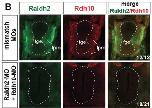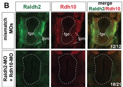 (B) Immunofluorescence of the NF34 Xenopus foregut region from control and rdh10-MOs + raldh2-MO- injected embryos confirms effective Rdh10 and Raldh2 knockdown in the foregut lpm. Abbreviations: fge, foregut endoderm; lpm, lateral plate mesoderm. Numbers in the lower right corner indicate the numbers of embryos with the observed staining pattern.