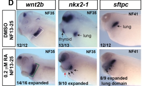 Figure S4 D relevant to Figure 4. Additional analyses of RA loss-of-function in Xenopus (D) RA gain-of-function results in an expansion of the respiratory field. Xenopus embryos were treated from NF13-25 with either DMSO vehicle or 0.2 μM of RA, cultured until either NF35 or NF41, and then assayed by in situ hybridization for expression of the indicated genes. Exogenous RA expands the nkx2-1+ and sftpc+ respiratory field throughout the pharyngeal region (black arrows), and inhibits thyroid expression of nkx2-1 (red arrow)