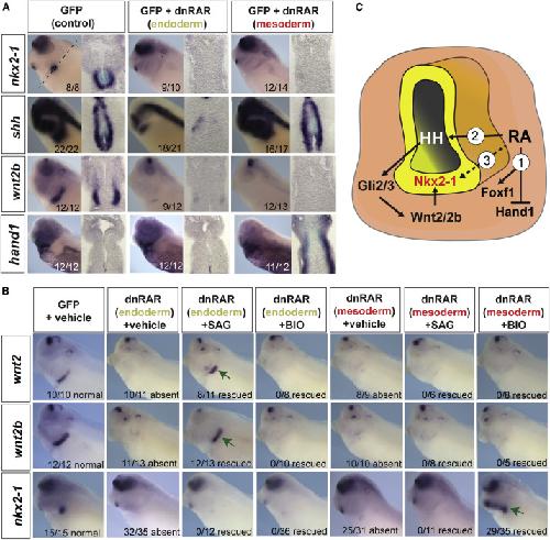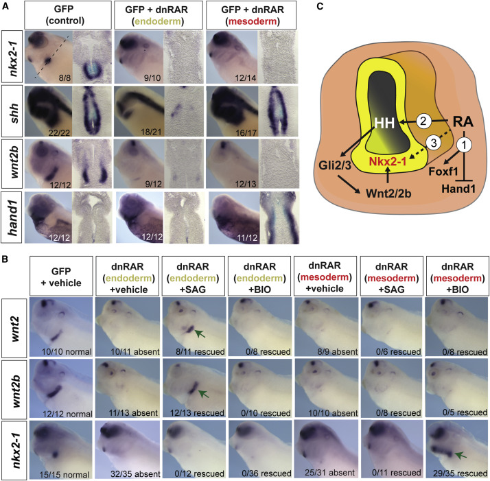 (B) Rescue experiments in dnRAR embryos using Hh or Wnt/β-catenin agonists SAG and BIO. SAG rescues wnt2 and wnt2b in endoderm-targeted dnRAR, whereas BIO rescues nkx2-1 in mesoderm-targeted dnRAR. The green arrows indicate rescued expression.