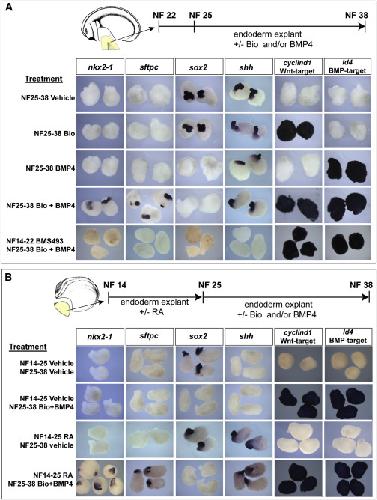 (A) Endoderm explants dissected at NF22 were treated with Bio, BMP4, or Bio + BMP4 from NF25â38 and assayed by in situ hybridization with the indicated probes. Bio + Bmp4 induces nkx2-1/sftpc+ respiratory fate, but pre-treatment of embryos from NF14â22 with the pan-RAR antagonist BMS493 prevents respiratory induction and shh expression. BMP4 represses sox2 and induces the BMP-target gene id4, whereas Bio induces the Wnt-target gene cyclind1.