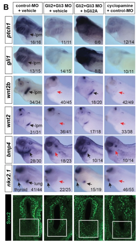 (B) In-situ hybridization using the indicated probes on NF34 embryos that were either injected at the 4/8- cell stage into the presumptive foregut mesendoderm with control-MO (20 ng), Gli2+Gli3-MOs (10 ng each), or treated with vehicle or Cyclopamine from NF20-34. Red arrows indicate regions of reduced or absent gene expression in the foregut domain. Loss / severe reduction of ptch1 and gli1 confirms the effective reduction in Hh signaling activity, and co-injection of an RNA encoding an hGli2A (125 pg) rescued lung development confirming the specificity of the Gli2/3-MO depletion. Sox2 immunofluorescence (green) shows abnormal expression of Sox2 in the ventral foregut (boxed area) of cyclopamine-treated and Gli2/3-MO-injected embryos. Abbreviations: lpm; lateral plate mesoderm. The number of embryos exhibiting the phenotype is indicated in the lower right of each panel.