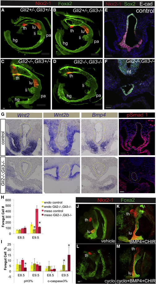 (JâM) Treatment of E8.5 mouse foregut explants with cyclopamine (cyclo) for 2 days results in loss of Nkx2-1+ respiratory progenitors phenocopying the Gli2â/â;Gli3â/â mutants. Nkx2-1+/Foxa2+ respiratory fate in Hh-signaling deficient explants was rescued by addition of CHIR (to stabilize β-catenin) and BMP4 (thyroid, th, and lung, lu).