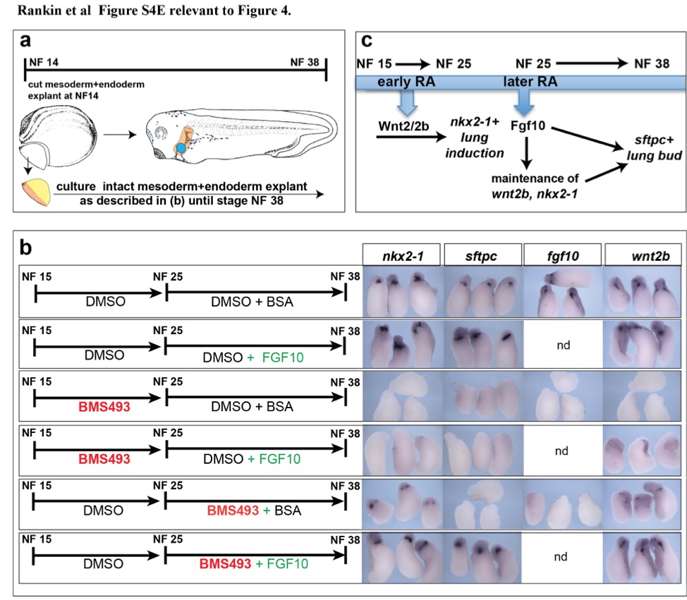 (a,b) A schematic of the experimental design. Intact foregut explants (endoderm + mesoderm) were dissected at NF14 and cultured as describe in (b) until NF38. In-situ hybridization of foregut explants at NF38 shows that BMS493 treatment from NF15-25inhibits expression of nkx2-1 and wnt2b; expression of these genes cannot be rescued by culture with exogenous FGF10. In contrast BMS493 treatment from NF25-35 reduces expression of nkx2-1, wnt2b and inhibits expression of sftpc; however exogenous FGF10 is able to rescue expression of these genes when added during the NF25-38 time period. The two temporal roles for RA signaling are diagrammed in (c).