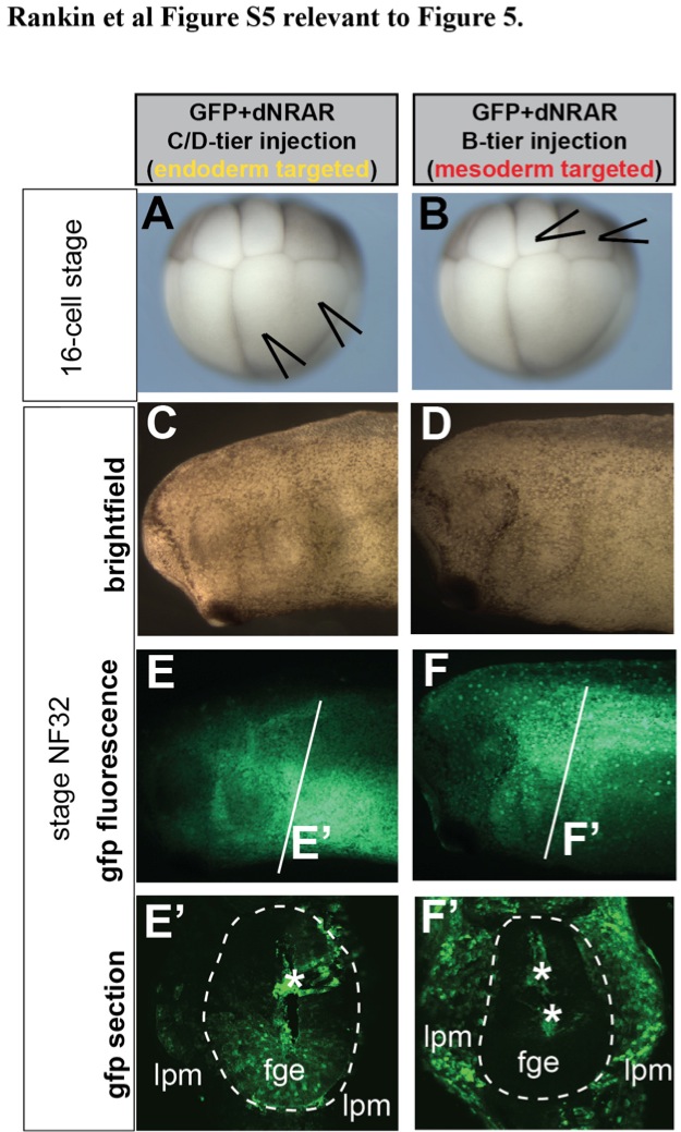 (C,D) Brightfield and (E,F) fluorescence images of NF32 embryos showing localization of the descendants of the injected blastomeres. White lines in E, F indicate plane of section (sections shown in Eâ, Fâ). White asterisks indicate some cells sloughed off into the endodermal lumen (a common event) and white dashed line signifies the endoderm-mesoderm boundary. Abbreviations: fge, foregut endoderm; lpm, lateral plate mesoderm