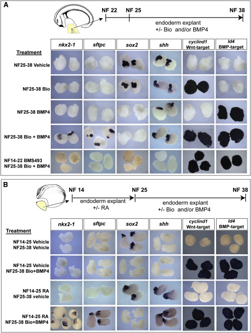(B) Endoderm isolated at NF14 is not competent to express nkx2-1 or sftpc in response to subsequent Bio + BMP4 treatment from NF25â38. However, after RA treatment of endoderm from NF14â25, nkx2-1/sftpc+ respiratory progenitors are induced in response to Wnt and BMP4 activation.