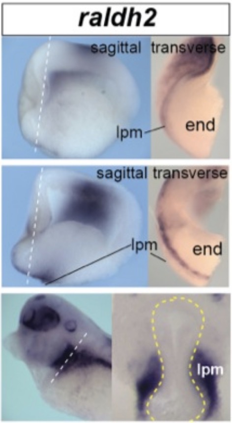 (A) In situ hybridization of RA pathway components at stages NF15, NF20, and NF34. For stages NF15 and 20 sagittal and transverse views of bisected embryos are shown. Dashed white line on the sagittal view shows plane of section shown in the transverse view. For NF34, white dashed line indicates plane of section shown; yellow dashed line outlines the endoderm. Expression of raldh2 is restricted to the mesoderm at all stages examined, whereas rar alpha is detected in both mesoderm and endoderm at all stages examined. Rar gamma is expressed in the anterior-most endoderm and mesoderm at NF15 and NF20, however is down-regulated in the foregut by NF34. Abbreviations: lpm, lateral plate mesoderm; end, endoderm; ae, anterior endoderm; fge, foregut endoderm.