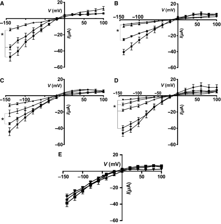 Figure 1. (A) The current–voltage (I–V) plot for voltage‐clamped Xenopus oocytes expressing Ba‐sensitive currents. ROMK expressed either alone (■), or ROMK with: WNK4 (▲) or WNK4 + KLHL3 WT (●). Mean ± sem (n = 6), *P < 1E−6 vs ROMK + WNK4. (B) The current–voltage (I–V) plot for voltage‐clamped Xenopus oocytes expressing Ba‐sensitive currents. ROMK expressed either alone (■), or ROMK with: WNK4 (▲) WNK4 + CUL3 WT (●), WNK4 + CUL3Δ403‐459 (♦). Mean ± sem (n = 6), *P < 1E−6 versus CUL3. (C) The current–voltage (I–V) plot for voltage‐clamped Xenopus oocytes (expressing Ba‐sensitive currents either ROMK alone (■), or ROMK with: WNK4 (▲), WNK4 + CUL3 WT + KLHL3 WT(●), WNK4 + CUL3 WT + KLHL3 WT + 1 μmol/L MLN 4924 (♦). Mean ± sem (n = 6), *P < 1E−6 versus absence of MLN 4924. (D) The current–voltage (I–V) plot for voltage‐clamped Xenopus oocytes expressing Ba‐sensitive currents. ROMK expressed either alone (■), or ROMK with: WNK4 (♦), WNK4 + CUL3 WT (●), WNK4 + CUL3Δ403‐459 (▲) or WNK4 + CUL3 WT + CUL3Δ403‐459 (▼). Mean ± sem (n = 6), *P < 1E−6 versus CUL3 alone. (E) The current–voltage (I–V) plot for voltage‐clamped Xenopus oocytes expressing Ba‐sensitive currents. ROMK expressed either alone (■), or with CUL3 WT + KLHL3 WT (▲),or CUL3Δ403‐459 + KLHL3 WT (▼). Mean ± sem (n = 5), No significant differences observed between the three different treatments.