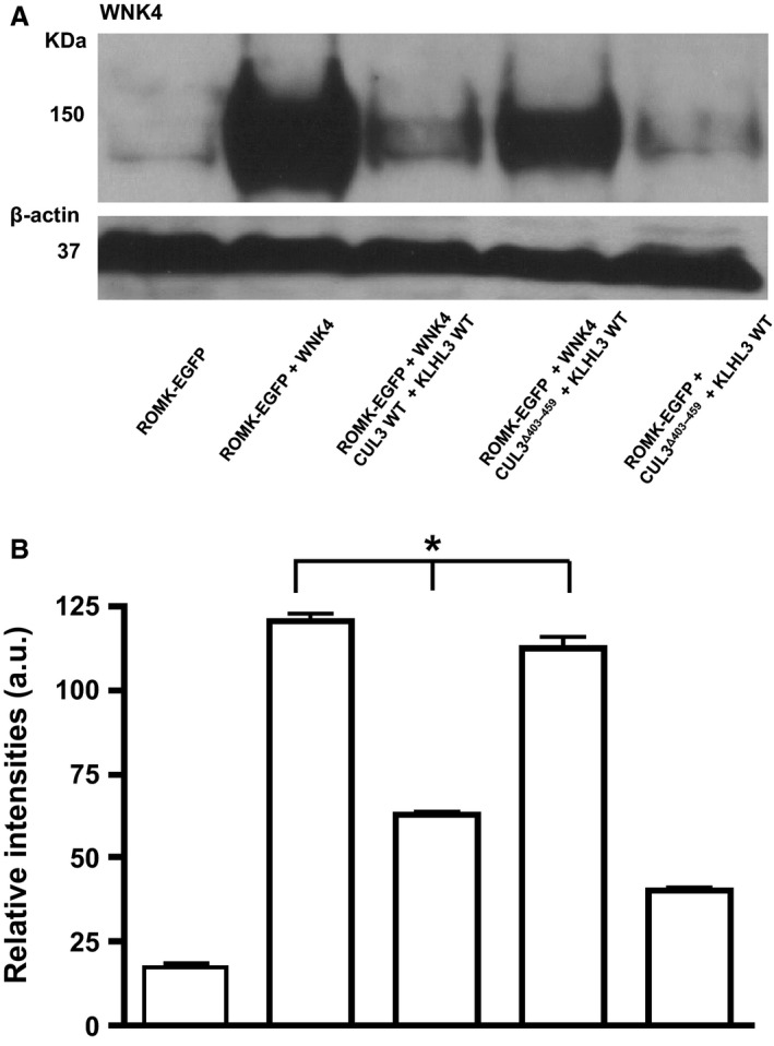 Figure 2. (A) Effect of CUL3 on the WNK4 protein levels in the mouse M‐1 CCD cell line. Total protein lysates were blotted from M‐1 CCD cells transfected with ROMK alone (far left) or ROMK with the constructs indicated. Lane 5 (far right) is a control where WNK4 has not been transfected into the cells. Anti‐WNK4 antibody (residues 1221–1243 of human WNK4, S064B) detected a 150 KDa WNK4 band. β‐actin was the loading control. This is representative of Western blots replicated three times with cell lysates from three different passage numbers. (B) Quantification of Western blots showing WNK4 levels normalized to its β‐actin loading control. Error bars represent mean ± sem of Western blots (n = 3). *P < 0.0001 by one‐way ANOVA.