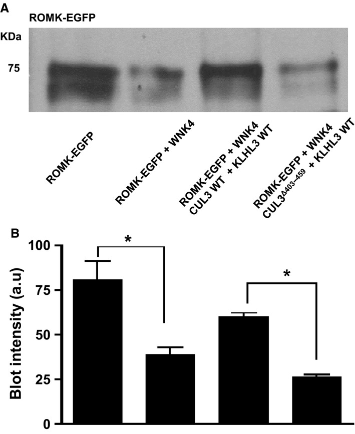 Figure 3. (A) Effect of CUL3 on the biotinylated ROMK‐EGFP levels in the M‐1 CCD cell line. Total protein lysates were blotted from M‐1 CCD cells transfected with ROMK‐EGFP alone or ROMK‐EGFP with constructs indicated. Anti‐KCNJ1 antibody detected a band at around 75 KDa for ROMK‐EGFP. This is representative Western blots replicated 3 times with cell lysates from three different passage numbers. (B) Quantification of Western blots showing ROMK levels in biotinylated cell lysates. Error bars represent mean ± sem of Western blots (n = 3). *P < 0.05.