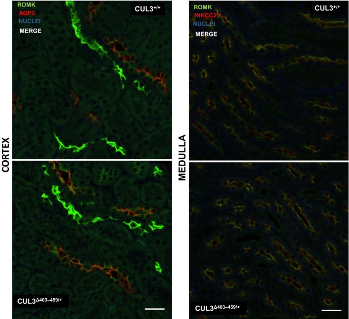 Figure 5. Immunostaining of ROMK (green) and AQP2 (red) in the cortex and apical immunostaining of ROMK (green) and total NKCC2 (red) in the medulla of CUL3Δ403‐459/+ kidney versus littermate controls CUL3+/+. These are representative pseudocolored average intensity z‐projections of immunofluorescent‐stained kidney sections (4 per genotype) and four independent immunostaining experiments, showing the distribution of total protein. Colocalization is in orange. Scale bar = 30 μm.