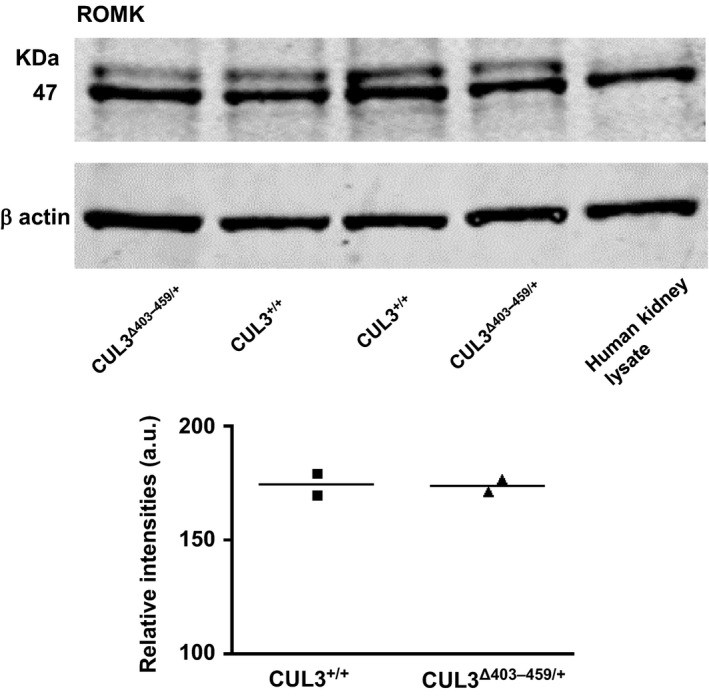 ROMK levels in the CUL3Δ403‐459/+ versus CUL3+/+ mouse kidney. Total protein from whole mouse kidney lysates immunoblotted with anti‐KCNJ1 antibody detected a band at ~47 KDa in both the mouse and human kidney lysates (as positive control). β actin was the loading control. The individual densitometry of each lane is shown (the bar is the average).