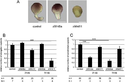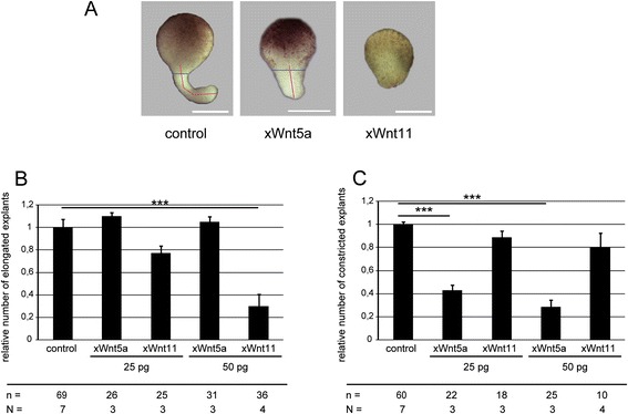 Fig. 1. xWnt11 impairs elongation, xWnt5a impairs constriction. a Representative phenotypes of DMZ explants. The overexpression of xWnt5a results in broader, less elongated explants; the overexpression of xWnt11 inhibits elongation. Elongation and constriction were determined by phenotypically analyzing the length (red line) and width (blue line) of the outgrowth. Control explants show a protrusion with length >â>âwidth. For explants with inhibited elongation (xWnt11), hardly any protrusion can be detected. In explants showing failures in constriction, the protrusion is broader at the expense of length (xWnt5A). Constriction of explants that did not elongate could not be determined. b Quantification of elongation. xWnt5a has no influence on elongation, whereas xWnt11 inhibits elongation in a dose-dependent manner. c Quantification of constriction. xWnt5a inhibits constriction in a dose-dependent manner, xWnt11 has no significant influence on constriction of the explants. Shown is the frequency of the indicated phenotypes. The superimposed error bars illustrate the variation between N independent experiments (biological replicates). In each experiment, the absolute frequency of the indicated phenotypes was normalized to the control siblings. In total, 69 explants of the uninjected controls could be analyzed, 60 of which elongated and could be evaluated for constriction. For 50 pg xWnt11 this means that nâ=â36 explants were analyzed for ârelative elongationâ, but only nâ=â10 explants could be considered to analyze relative constriction. N: number of biological replicates; n: number of analyzed explants. *** Pâ<â0.001 according to Fisherâs exact test; Bars: 200 μm