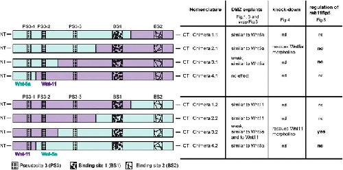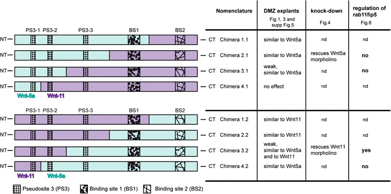 Fig. 2. Summarizing scheme of Wnt5a/Wnt11 chimeras and their effects