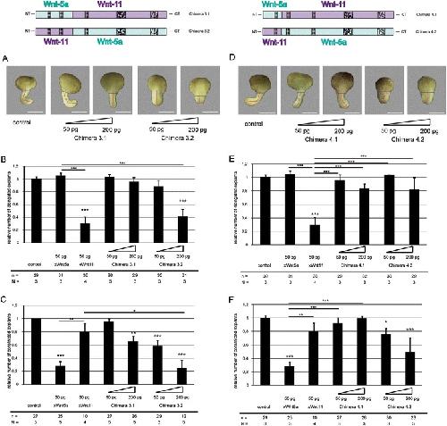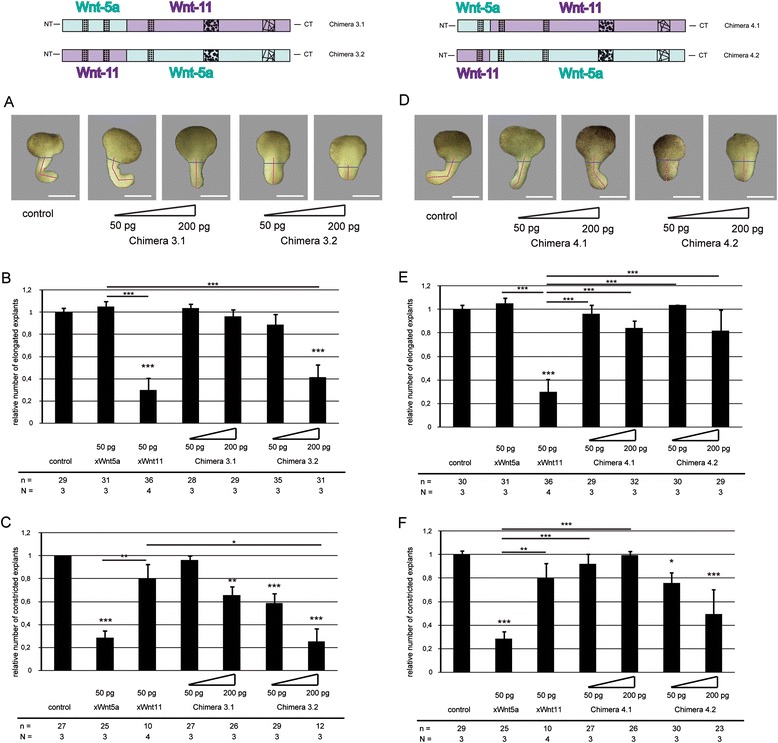 Fig. 3. Analysis of chimera pair 3 and 4 in dorsal marginal zone (DMZ) explants. a Representative phenotypes of DMZ explants of embryos injected with the indicated mRNAs of chimera pair 3. Wnt5a/Wnt11 Chimera 3.1 inhibits constriction, whereas Wnt11/Wnt5a chimera 3.2 influences constriction and elongation. b Quantification of elongation. c Quantification of constriction. d Representative phenotypes of DMZ explants of embryos injected with the indicated mRNAs of chimera pair 4. Wnt5a/Wnt11 chimera 4.1 does not disturb convergent extension movements, whereas Wnt11/Wnt5a chimera 4.2 inhibits constriction. e Quantification of elongation. f Quantification of constriction. Shown is the frequency of the indicated phenotypes. The superimposed error bars illustrate the variation between N independent experiments. In each experiment, the absolute frequency of the indicated phenotypes was normalized to the control siblings. N: number of biological replicates, n: number of analyzed explants, *** Pâ<â0.001, ** Pâ<â0.01, * Pâ<â0.05 according to Fisherâs exact test, Bars: 200 μm