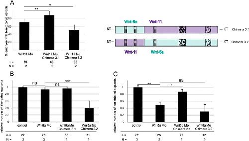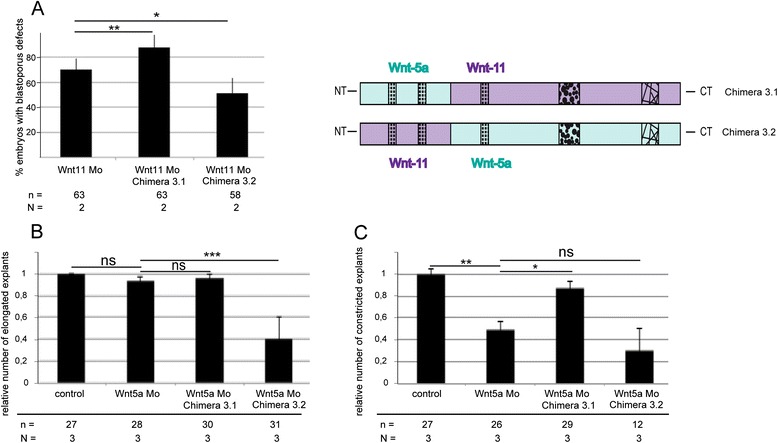 Fig. 4. Rescue experiments chimera. To test whether the chimeric constructs can compensate for the loss of xWnt11 and xWnt5a, 200Â pg of Wnt5a/Wnt11 chimera 3.1 and Wnt11/Wnt5a 3.2 were co-injected with 2.5 pmol of an xWnt11 (Wnt11 Mo) and xWnt5a (Wnt5a Mo) morpholino (Mo) antisense oligonucleotide. a To determine the effect of the Wnt11 Mo, we counted the fraction of stage 12 embryos with open blastopore (blastopore defects). To test whether the chimeric constructs can compensate for the loss of xWnt5a we calculated (b) relative elongation and (c) relative constriction of dorsal marginal zone explants. Shown is the frequency of the indicated phenotypes. The superimposed error bars illustrate the variation between N independent experiments. N: number of biological replicates, n: number of analyzed explants, *** Pâ<â0.001, ** Pâ<â0.01, * Pâ<â0.05 according to the Ï2 test (a) and Fisherâs exact test (b, c)
