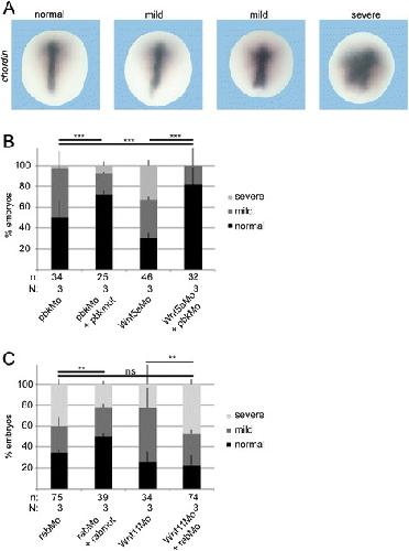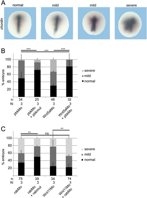 Fig. 8. Epistasis experiments. Injection of antisense morpholinos specific for xWnt5a (Wnt5aMo), xWnt11 (Wnt11Mo), pbk (pbkMo), and rab11fip5 (rabMo) impaired convergent extension movements as seen as mild phenotype by a shortened and broad chordin expression or a strong phenotype by a blurred chordin expression or a staining at the borders of the non-closing blastoporus. a Shows representative dorsal marginal zone explants. b Quantification of the epistasis experiments revealed that knock-down of pbk can compensate for the loss of xWnt5a, but (c) knock-down of rab11fip5 cannot compensate for the loss of xWnt11. Shown is the absolute frequency of the indicated phenotypes. The superimposed error bars illustrate the variation between N biological replicates. ** Pâ<â0.01, *** Pâ<â0.001 according to the Ï2 test, n: number of analyzed embryos