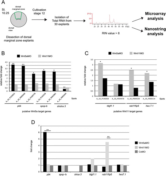 pbk and rab11fip5 are specific non-canonical Wnt target genes. a Dorsal marginal zone (DMZ) explants were dissected at stage 10.25 and cultivated until siblings reached stage 12. Total RNA was isolated from 30 DMZ explants. Samples with an RNA integrity number valueâ>â8 were analyzed in a microarray or nanostring analysis. b Differential regulation of six spots on the microarray representing three putative xWnt5a target genes. Shown is the average fold change of biological triplicates, the indicated P value is relative to the control morphant-injected explants, ** Pâ<â0.01, * Pâ<â0.05. c Differential regulation of four spots on the microarray representing three putative xWnt11 target genes. Shown is the average fold change of biological triplicates (d). Reevaluation of the six putative non-canonical Wnt target genes by nanostring analysis. Only pbk and rab11fip5 were found to be differentially regulated. Shown is the average fold change of biological triplicates. ** Pâ<â0.01 according to one-sample t test