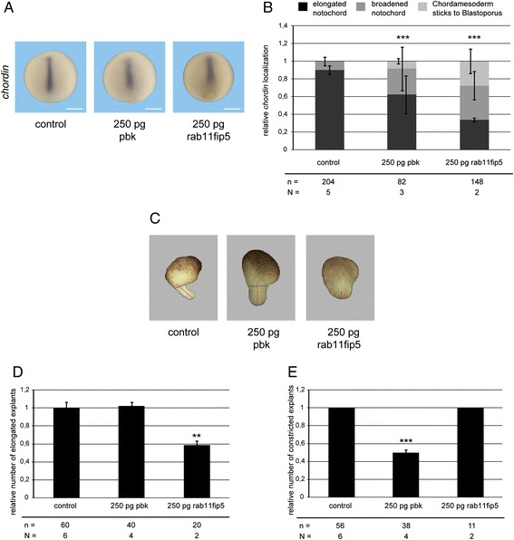 Fig. 7. Pbk and rab11fip5 interfere with convergent extension movements. a Representative whole mount in situ hybridization for chordin of stage 12 embryos injected dorsal equatorially at the 4-cell stage with the indicated mRNAs. The dorsal overexpression of pbk and rab11fip5 results in a shorter and broader chordin expression. Bars: 500 μm. b Quantification of chordin phenotypes. *** Pâ<â0.001 according to Ï2 significance test (c). Phenotypes of dorsal marginal zone (DMZ) explants derived from pbk and rab11fip5 overexpressing embryos. Overexpression of pbk leads to broader elongated explants and overexpression of rab11fip5 results in an inhibition of elongation. Bars: 200 μm. d Quantification of elongation. Pbk does not interfere with elongation but rab11fip5 significantly inhibits elongation. e Quantification of constriction. Pbk overexpressing DMZ explants fail to constrict whereas rab11fip5 does not affect constriction. Shown is the frequency of the indicated phenotypes. In each experiment, the absolute frequency of the indicated phenotypes was normalized to the control siblings. The superimposed error bars illustrate the variation between N independent experiments. ** Pâ<â0.01, *** Pâ<â0.001 according to Fisherâs exact test. N: number biological replicates, n: number of analyzed embryos/explants